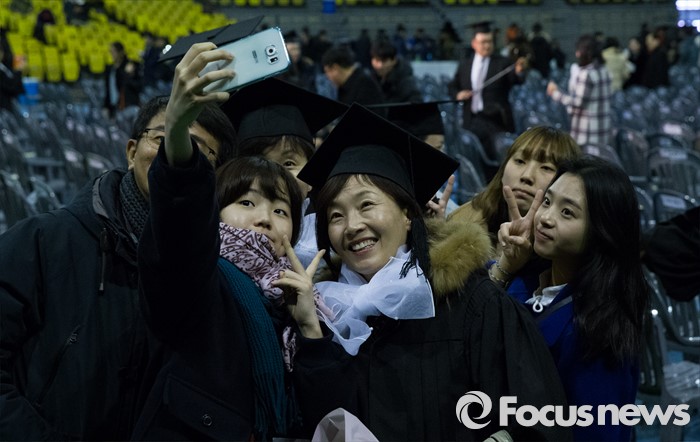(서울=포커스뉴스) 24일 오후 서울 송파구 올림픽체조경기장에서 열린 '한국방송통신대학교 2015학년도 학위수여식'에 참석한 졸업생이 가족들과 기념사진을 찍고 있다.
