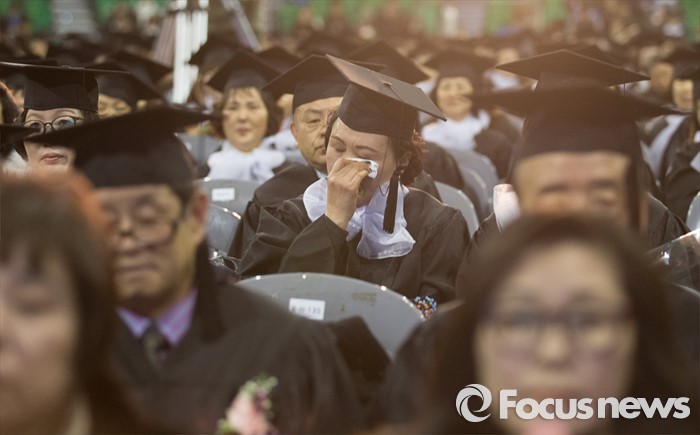 (서울=포커스뉴스) 24일 오후 서울 송파구 올림픽체조경기장에서 열린 '한국방송통신대학교 2015학년도 학위수여식'에 참석한 졸업생이 눈물을 흘리고 있다.