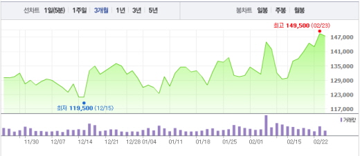 이날 유가증권시장에서 SK이노베이션은 전일 대비 1000원(0.67%) 떨어진 14만7500원에 거래를 마쳤다. 전날 52주 신고가를 깬 SK이노베이션은 이날 장 초반 14만6000원대까지 떨어졌지만 흐름을 다시 회복했다.