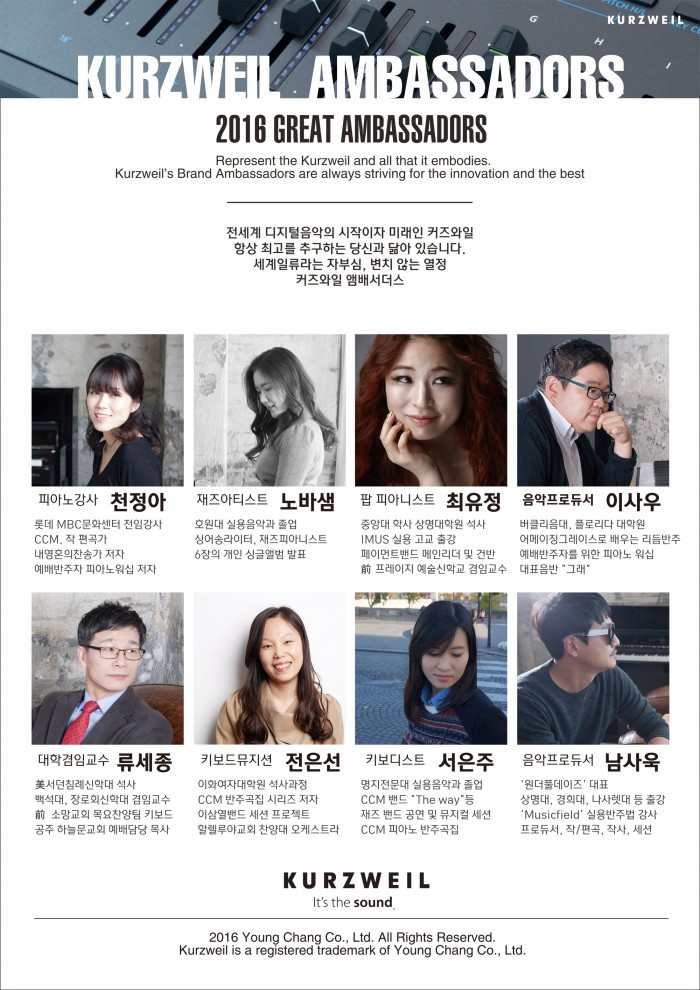 (서울=포커스뉴스) 영창뮤직은 유명 뮤지션들로 구성된 '2016 커즈와일 앰배서더스'를 24일 발표했다.