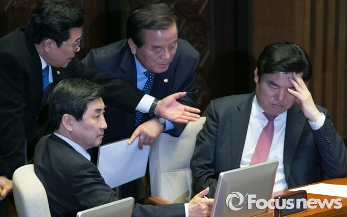 (서울=포커스뉴스) 테러방지법 직권상정에 반발해 야당의 무제한 토론(필리버스터)이 진행되고 있는 24일 오후 서울 여의도 국회 본회의장에서 원유철(오른쪽부터) 새누리당 원내대표, 정갑윤 국회 부의장, 전병헌 더불어민주당 의원, 이종걸 원내대표가 대화하고 있다.