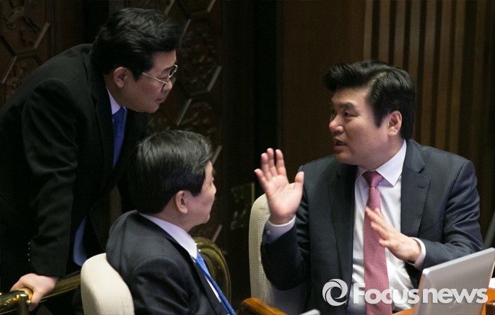 (서울=포커스뉴스) 테러방지법 직권상정에 반발해 야당의 무제한 토론(필리버스터)이 진행되고 있는 24일 오후 서울 여의도 국회 본회의장에서 원유철(오른쪽부터) 새누리당 원내대표, 전병헌 더불어민주당 의원, 이종걸 원내대표가 대화하고 있다.