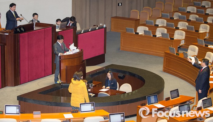 (서울=포커스뉴스) 테러방지법 직권상정에 반발해 야당의 무제한 토론(필리버스터)이 진행되고 있는 24일 오후 서울 여의도 국회 본회의장에서 토론을 진행중인 박원석 정의당 의원을 향해 조원진 새누리당 원내수석부대표가 항의를 하고 있다.