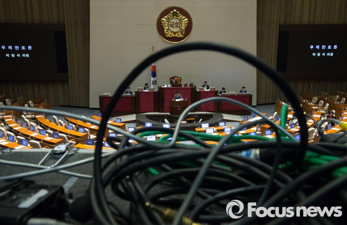 (서울=포커스뉴스) 테러방지법 직권상정에 반발해 야당의 무제한 토론(필리버스터)이 진행되고 있는 24일 오후 서울 여의도 국회 본회의장에서 박원석 정의당 의원이 발언하고 있다.