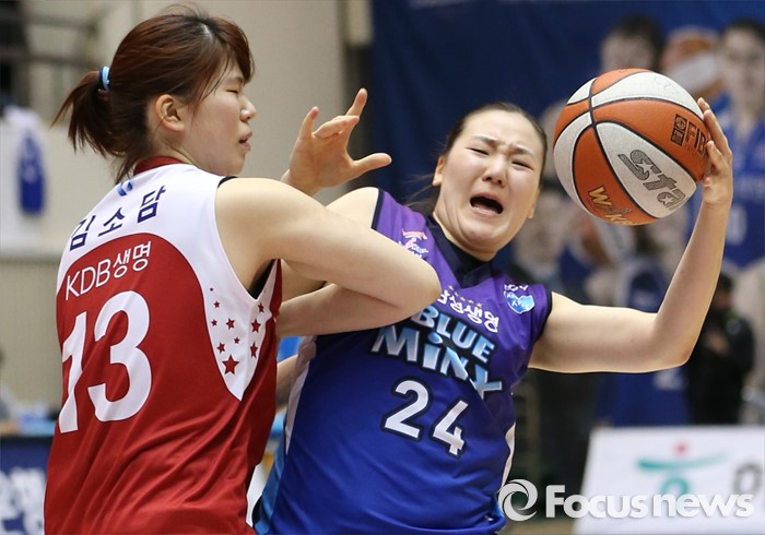 (구리=포커스뉴스) 24일 구리시체육관에서 열린 2015~2016 여자프로농구 KDB생명-삼성생명 경기에서 돌파를 시도하던 삼성생명 배혜윤을 KDB생명 김소담이 팔꿈치로 저지하고 있다.