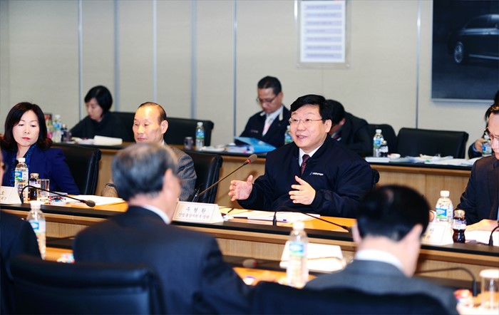(성남=포커스뉴스) 주형환 산업통상자원부 장관이 24일 오후 경기도 판교에 소재한 자동차 전장부품생산 중견기업인 ㈜유라코퍼레이션 회의실에서 열린 중견기업계 대표들과의 간담회에 참석해 모두발언을 하고 있다.