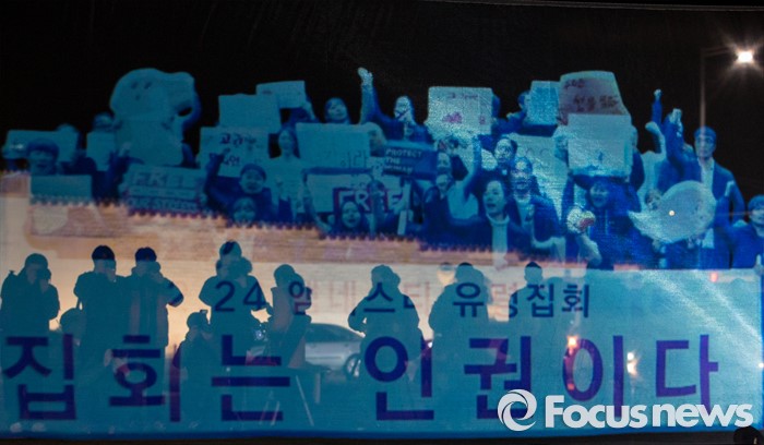 (서울=포커스뉴스) 24일 오후 서울 광화문광장에서 3차원 영상(홀로그램)을 이용해 열린 '2ㆍ24 앰네스티 유령집회'에서 '집회ㆍ시위 자유를 보장하라'는 주제의 영상이 스크린에 영사되고 있다.