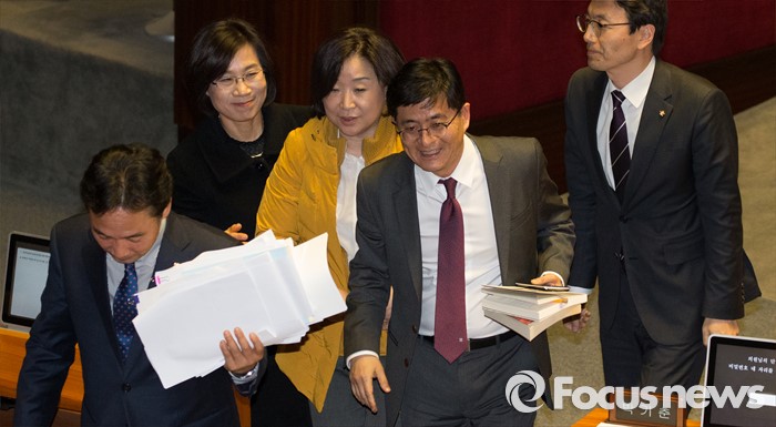 (서울=포커스뉴스) 테러방지법 직권상정에 반발해 야당의 무제한 토론(필리버스터)이 진행되고 있는 24일 오후 서울 여의도 국회 본회의장에서 박원석(오른쪽 두번째) 정의당 의원이 발언을 마치고 심상정 정의당 대표를 비롯한 동료의원들과 나서고 있다.