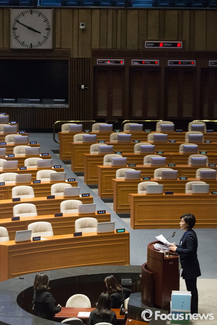 (서울=포커스뉴스) 테러방지법 직권상정에 반발해 야당의 무제한 토론(필리버스터)이 진행되고 있는 25일 새벽 서울 여의도 국회 본회의장에서 최민희 더불어민주당 의원이 발언을 하고 있다.