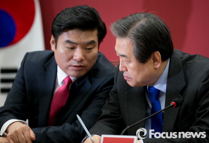 (서울=포커스뉴스) 김무성(오른쪽) 새누리당 대표와 원유철 원내대표가 25일 오전 서울 여의도 국회에서 열린 최고위원회의에 참석해 대화하고 있다.