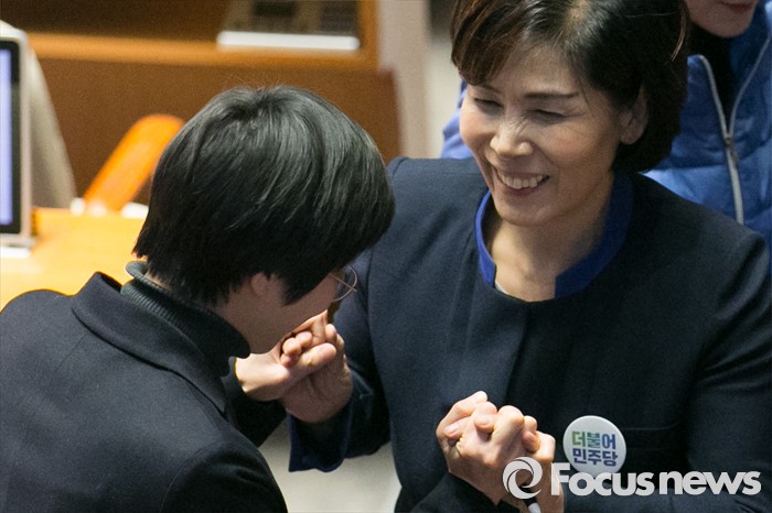 (서울=포커스뉴스) 최민희 더불어민주당 의원이 25일 오전 서울 여의도 국회 본회의장에서 테러방지법 저지를 위한 무제한 토론(필리버스터)을 마친 뒤, 동료의원들의 격려를 받고 있다.