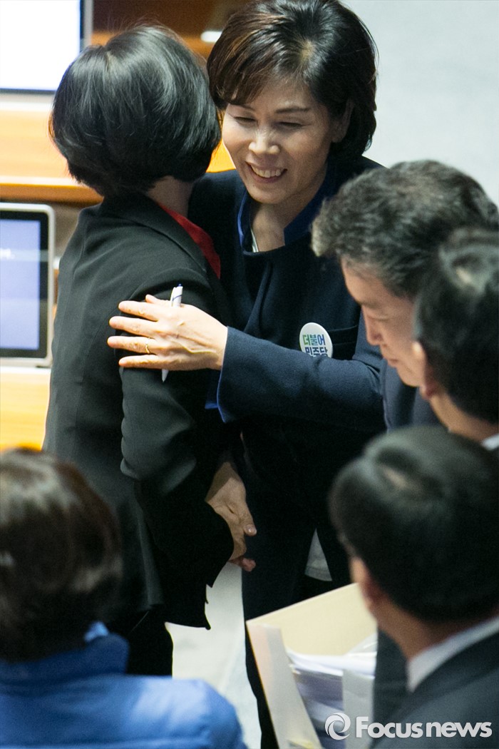 (서울=포커스뉴스) 최민희 더불어민주당 의원이 25일 오전 서울 여의도 국회 본회의장에서 테러방지법 저지를 위한 무제한 토론(필리버스터)을 마친 뒤, 동료의원들의 격려를 받고 있다.