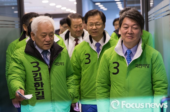 (서울=포커스뉴스) 국민의당 안철수, 천정배 상임공동대표를 비롯한 지도부가 25일 오전 서울 마포 당사에서 열린 선거대책위원회 회의에 입장하고 있다. 오른쪽부터 안 대표, 천 대표, 김한길 상임선대위원장