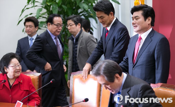 (서울=포커스뉴스) 김무성 새누리당 대표 등 지도부가 25일 오전 서울 여의도 국회에서 열린 최고위원회의에 참석하고 있다.