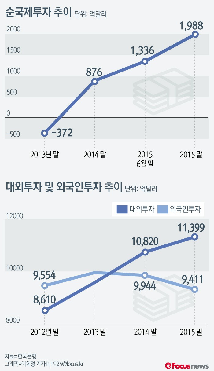(서울=포커스뉴스) 25일 한국은행이 발표한 '국제투자대조표(잠정)'에 따르면 순국제투자잔액은 2015년 1,988억달러로 2014년 말(876억달러)에 비해 1,112억달러 증가했다. 2015년말 대외 투자잔액은 1조1,399억달러로 전년말에 비해 증가하였고, 외국인투자 잔액은 9,411억달러로 전년말대비 감소했다.