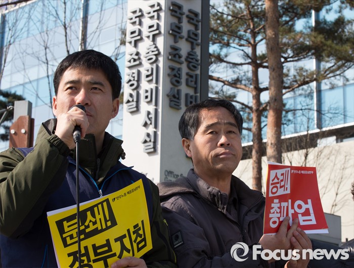 (세종=포커스뉴스) 25일 오전 세종시 정부세종청사 국무총리실 앞에서 민중총궐기 충남 운동본부 구성원들이 기자회견을 열고 박근혜 정권 출범 3년 민중궐기대회에서 민중의 분노를 보여주겠다고 주장하고 있다.