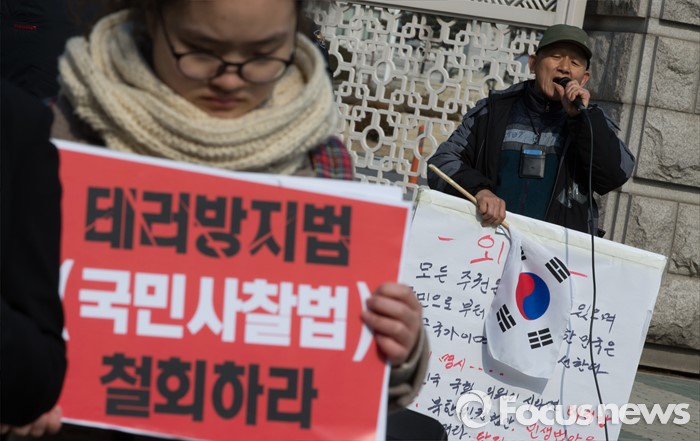 (서울=포커스뉴스) 25일 오전 서울 여의도 국회 앞에서 한 보수단체 회원이 테러방지법 반대를 위해 무제한토론(필리버스터)을 이어가는 야당을 규탄하며 발언하고 있다. 왼쪽은 테러방지법 철회를 요구하며 필리버스터에 참가해 발언하는 시민들.