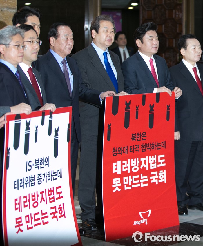 (서울=포커스뉴스) 테러방지법 직권상정에 반발해 야당의 무제한 토론(필리버스터)이 사흘째 진행되고 있는 25일 오전 서울 여의도 국회 본회의장 앞에서 김무성 새누리당 대표, 원유철 원내대표 등 지도부가 무제한 토론 비판 시위를 하고 있다.
