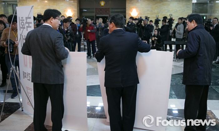(서울=포커스뉴스) 테러방지법 직권상정에 반발해 야당의 무제한 토론(필리버스터)이 사흘째 진행되고 있는 25일 오전 서울 여의도 국회 본회의장 앞에서 권성동(왼쪽부터), 조원진, 김성태 새누리당 의원이 무제한 토론 비판 시위를 하고 있다.