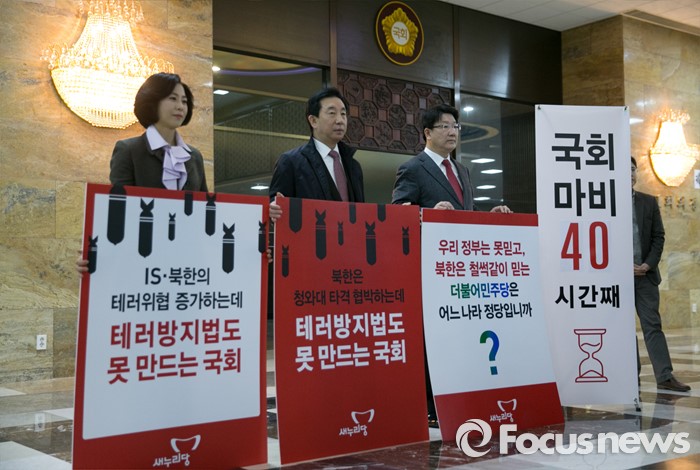 (서울=포커스뉴스) 테러방지법 직권상정에 반발해 야당의 무제한 토론(필리버스터)이 사흘째 진행되고 있는 25일 오전 서울 여의도 국회 본회의장 앞에서 신의진(왼쪽부터), 김성태, 권성동 새누리당 의원이 무제한 토론 비판 시위를 하고 있다.