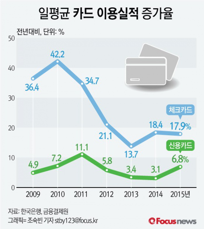 (서울=포커스뉴스) 25일 한국은행이 발표한 '2015년중 지급결제동향'에 따르면 신용카드 이용실적은 일평균 1조5000억원으로 2014년 3.1%에서 지난해 6.8%로 증가세가 확대됐다.