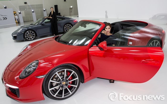 (서울=포커스뉴스) 25일 오전 서울 중구 동대문디지털플라자에서 모델들이 포르쉐 신형 911 카레라S(앞)와 911 카레라를 선보이고 있다.