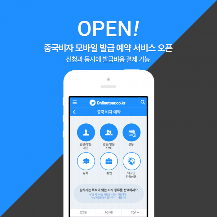 (서울=포커스뉴스) 온라인투어는 PC에서만 가능했던 중국비자 발급 예약을 모바일에서도 간편하게 이용할 수 있는 '중국비자 모바일 발급 예약 서비스'를 오픈했다고 25일 밝혔다.