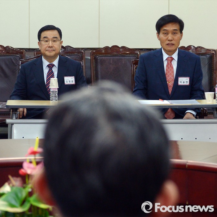 (서울=포커스뉴스) 25일 오전 서울 여의도 새누리당사에서 20대 총선 공천 신청자 면접심사에 참석한 박용현(오른쪽), 김정훈 부산 남구갑 예비후보가 면접심사를 보고 있다. 김 후보는 당 정책위의장을 맡고 있다.
