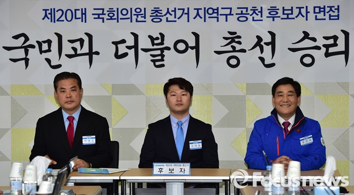 (서울=포커스뉴스) 25일 오전 서울 여의도 더불어민주당사에서 열린 20대 총선 공천 신청자 면접심사에 참석한 박영순(왼쪽부터), 고재일, 정현태 대전 대덕 예비후보가 홍창선 공천관리위원장 질의에 답하고 있다.