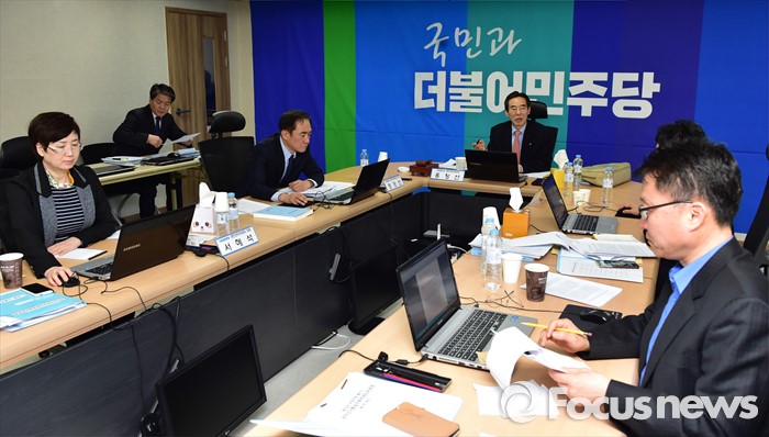 (서울=포커스뉴스) 25일 오전 서울 여의도 더불어민주당사에서 열린 20대 총선 공천 신청자 면접심사에 참석한 홍창선 공천관리위원장이 박영순, 고재일, 정현태 대전 대덕 예비후보에게 질의하고 있다.