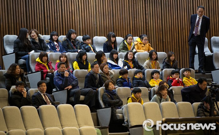 (서울=포커스뉴스) 김제남 정의당 의원이 25일 오전 서울 여의도 국회 본회의장에서 테러방지법 저지를 위한 무제한 토론(필리버스터)을 하고 있는 가운데 국회에 견학 온 학생들이 참관하고 있다.