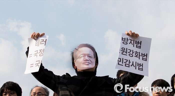 (서울=포커스뉴스) 25일 오후 서울 여의도 국회의사당 앞에서 테러방지법 제정을 반대하는 시민사회단체들이 정의화 국회의장 가면 착용 후 테러방지법 폐기 퍼포먼스를 하고 있다.