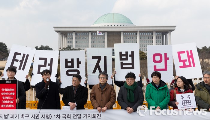(서울=포커스뉴스) 25일 오후 서울 여의도 국회의사당 앞에서 테러방지법 제정을 반대하는 시민사회단체들이 테러방지법 폐기 촉구 30만 시민서명 국회전달 기자회견을 하고 있다.