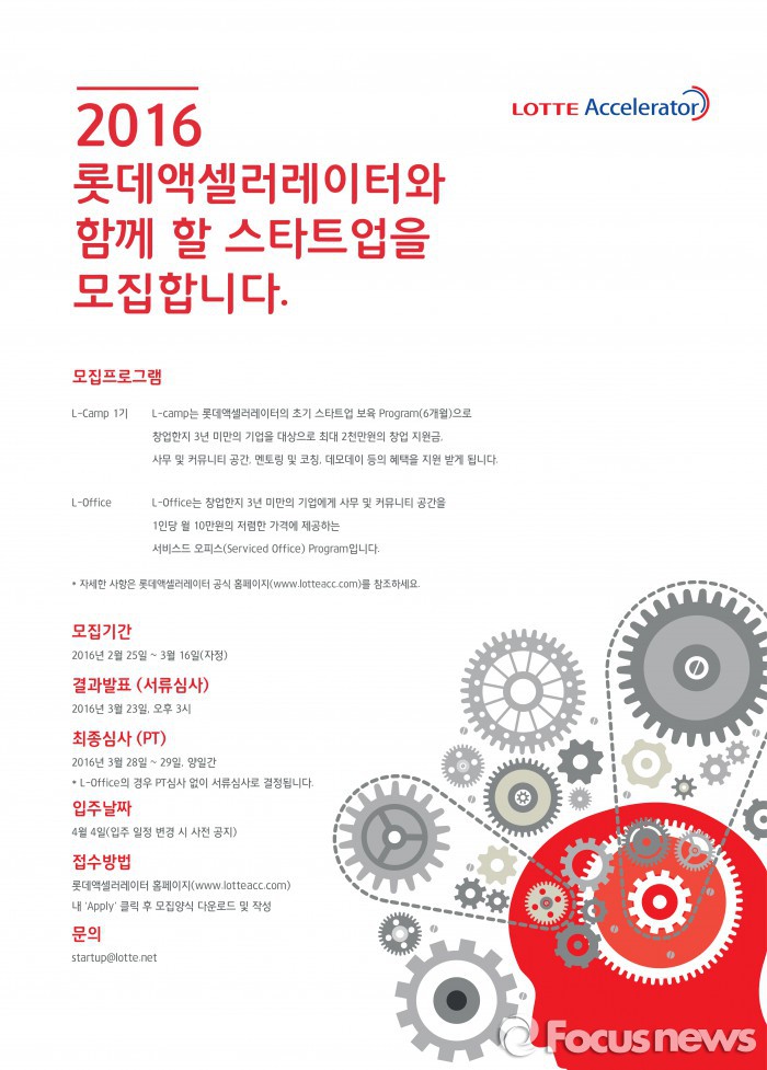(서울=포커스뉴스) 롯데그룹이 지난해 하반기부터 추진해온 청년창업 지원사업을 본격적으로 시작한다. 창업전문 투자법인 롯데액셀러레이터(LOTTE Accelerator)를 통해, 25일부터 스타트업(start-up·신생벤처기업) 모집에 나선다.