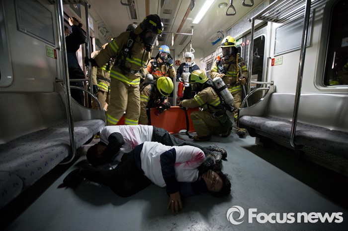 (서울=포커스뉴스) 25일 오후 서울 마포구 월드컵경기장역에서 실시한 지하철 대형사고 대응 불시 현장훈련에서 소방관들이 쓰러진 승객역을 맡은 시민들을 구조하고 있다.