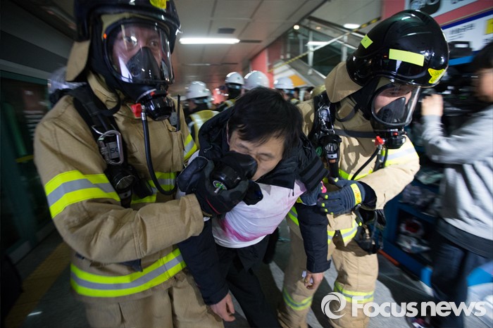 (서울=포커스뉴스) 25일 오후 서울 마포구 월드컵경기장역에서 실시한 지하철 대형사고 대응 불시 현장훈련에서 소방관들이 구조활동을 하고 있다.