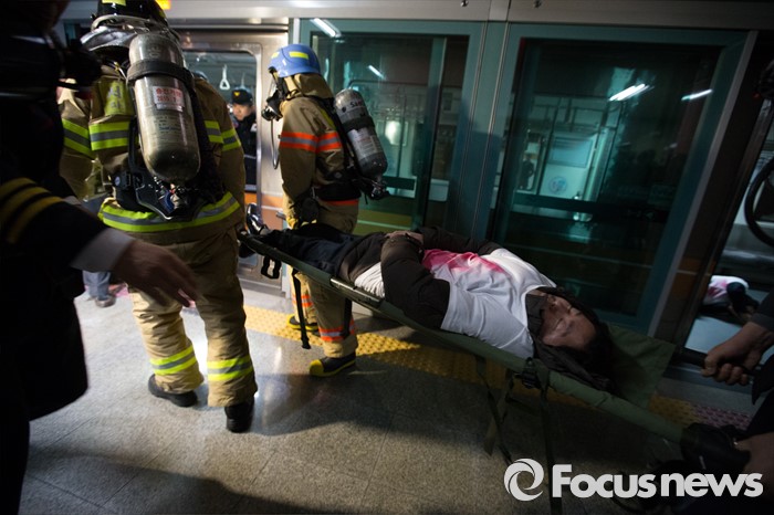 (서울=포커스뉴스) 25일 오후 서울 마포구 월드컵경기장역에서 실시한 지하철 대형사고 대응 불시 현장훈련에서 소방관들이 구조활동을 하고 있다.