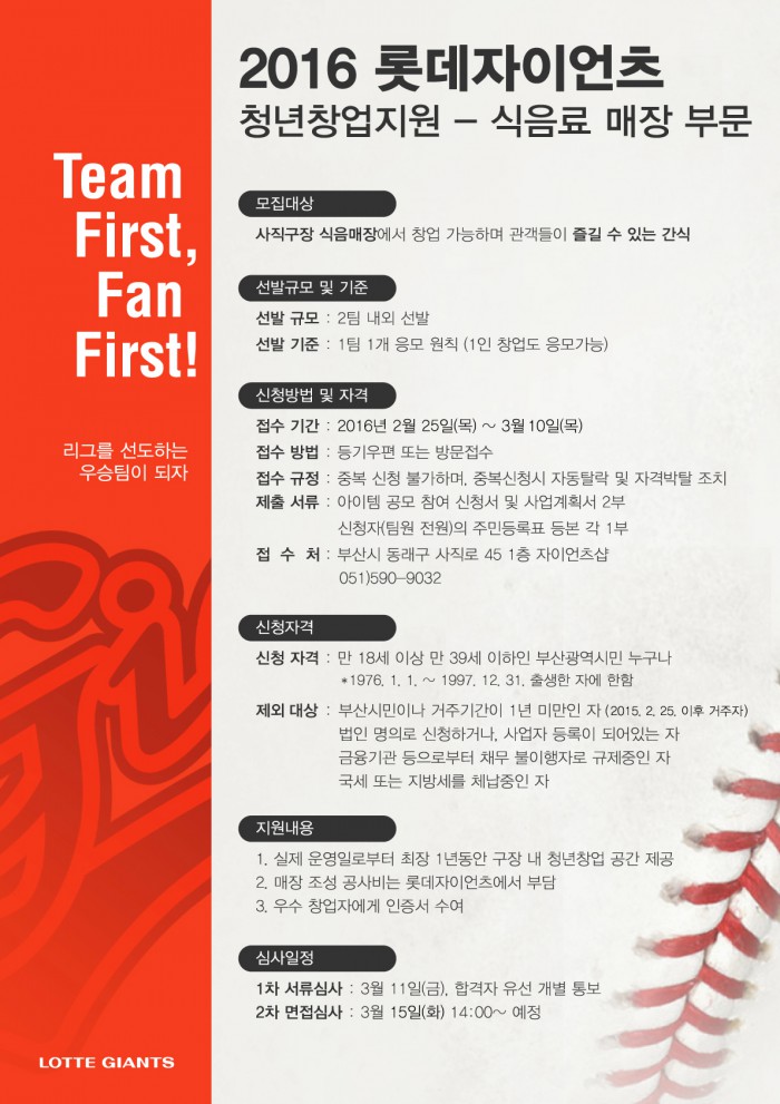 공모를 통해 진행되는 청년창업지원제도는 만 18세 이상 만 39세 이하인 부산시민이면 누구나 참여할 수 있다. 우수 창업 아이템으로 선정되면 인증서 수여 및 사직구장 내 청년창업 공간을 지원한다. 자세한 내용은 롯데자이언츠 홈페이지에서 확인할 수 있다.프로야구 롯데가 사직구장 내 식음매장에 청년창업지원제도를 도입한다. 사진은 청년창업지원 공모 포스터. <사진제공=롯데 자이언츠>