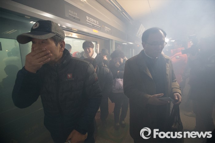 (서울=포커스뉴스) 25일 오후 서울 마포구 월드컵경기장역에서 실시한 지하철 대형사고 대응 불시 현장훈련에서 승객들이 대피하고 있다.