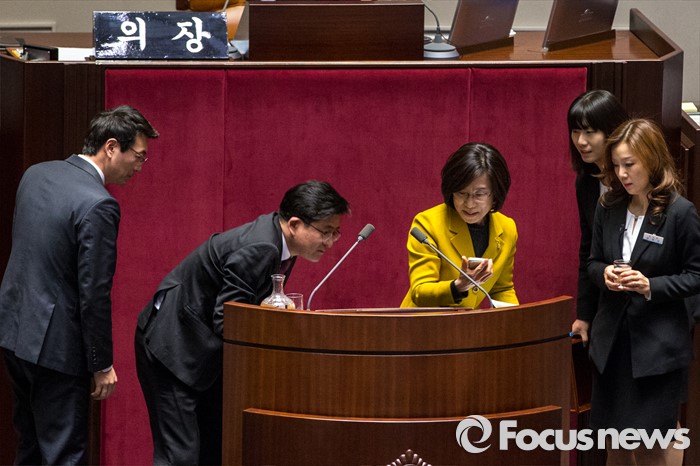 (서울=포커스뉴스) 테러방지법 직권상정에 반발해 야당의 무제한 토론(필리버스터)이 사흘째 진행되고 있는 25일 오후 서울 영등포구 국회 본회의장에서 김제남 정의당 의원이 발언을 마친 뒤 연단 주변을 정리하고 있다.