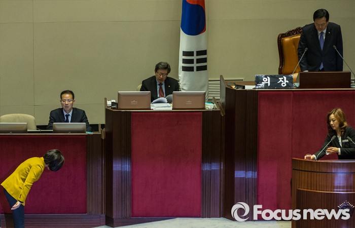 (서울=포커스뉴스) 테러방지법 직권상정에 반발해 야당의 무제한 토론(필리버스터)이 사흘째 진행되고 있는 25일 오후 서울 영등포구 국회 본회의장에서 김제남 정의당 의원이 발언을 마친 뒤 정의화 국회의장에게 인사 하고 있다.
