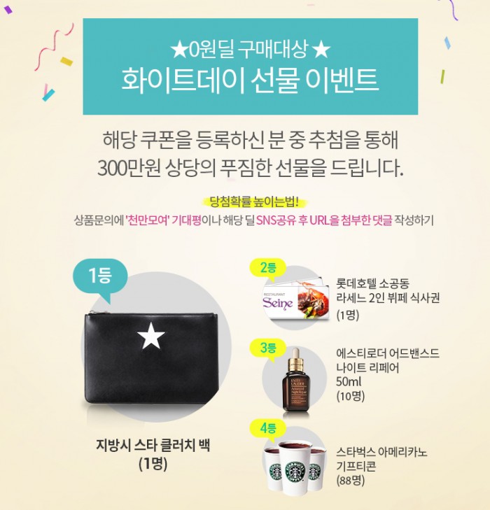 티몬 홈페이지에서 '천만모여' 앱 0원 딜 쿠폰을 무료로 구매한 뒤 상품문의에 기대평이나 해당 딜을 SNS(사회관계망서비스)에 공유한 후 URL(인터넷 주소)을 첨부한 댓글을 남기면 당첨확률이 높아진다.