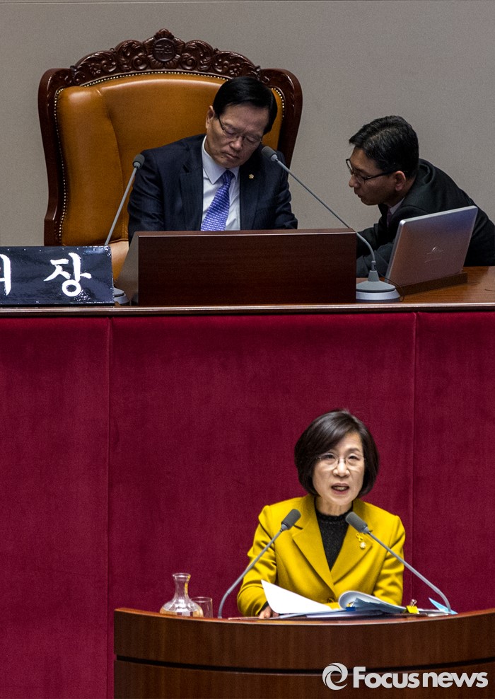 (서울=포커스뉴스) 테러방지법 직권상정에 반발해 야당의 무제한 토론(필리버스터)이 사흘째 진행되고 있는 25일 오후 서울 영등포구 국회 본회의장에서 김제남 정의당 의원이 발언을 하고 있다.