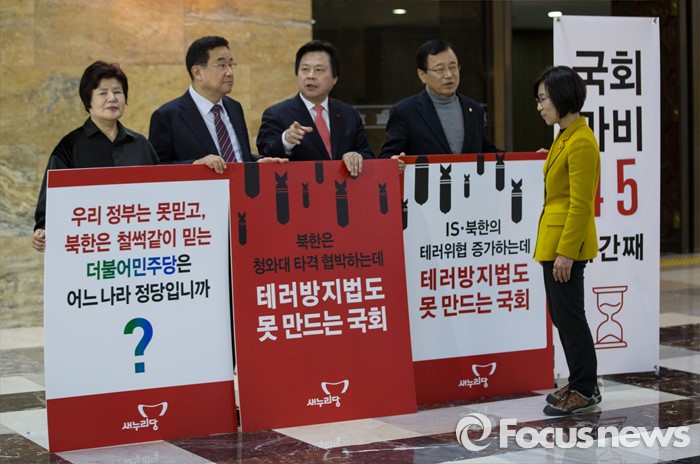 (서울=포커스뉴스) 테러방지법 직권상정에 반발해 야당의 무제한 필리버스터(무제한 토론)가 사흘째 진행되고 있는 25일 오후 서울 여의도 국회 본회의장 밖에서 토론을 마친 김제남 정의당 의원이 테러방지법 제정에 찬성하며 시위하는 여당의원들의 피켓을 살펴보고 있다.