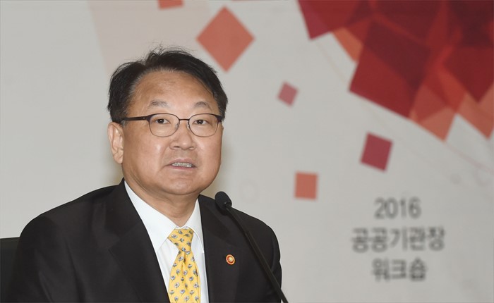 (서울=포커스뉴스) 유일호 부총리 겸 기획재정부 장관이 25일 서울 종로구 정부서울청사 별관에서 열린 공공기관 기관장 워크숍에 참석해 모두발언을 하고 있다. <사진제공=기획재정부>