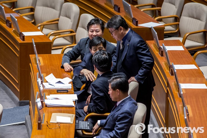 | △ 야당 의원들과 대화 나누는 조원진 새누리당 의원 |