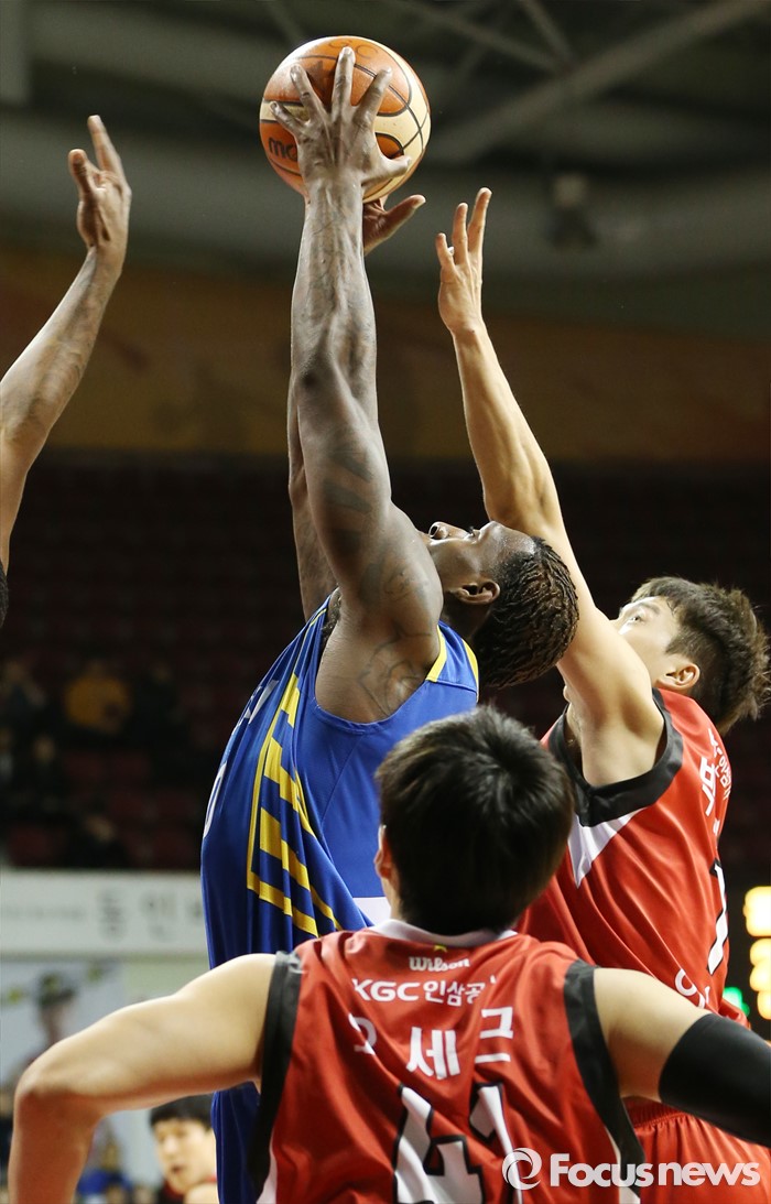 (안양=포커스뉴스) 25일 안양실내체육관에서 열린 2015-2016 프로농구 6강 플레이오프 KGC-삼성 1차전에서 삼성 라틀리프가 KGC 박찬희에 앞서 리바운드볼을 잡고 있다.