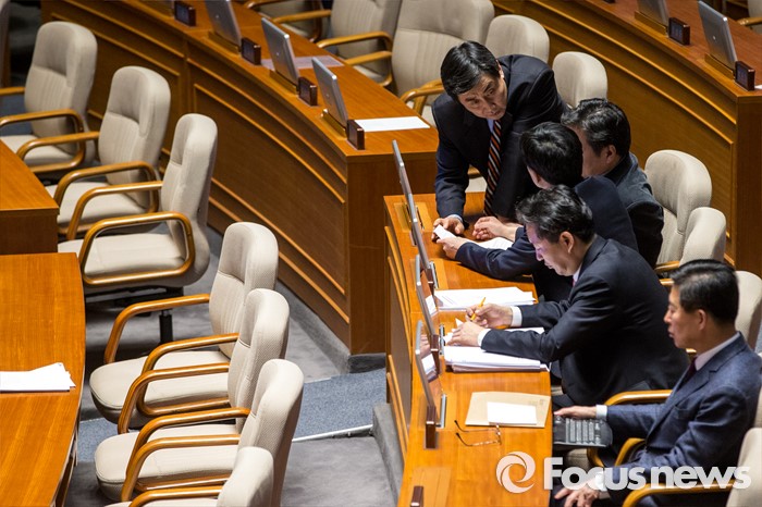 (서울=포커스뉴스) 테러방지법 직권상정에 반발해 야당의 무제한 토론(필리버스터)이 사흘째 진행되고 있는 25일 오후 서울 영등포구 국회 본회의장에서 이종걸 더불어민주당 원내대표가 동료 의원들과 대화를 나누고 있다.