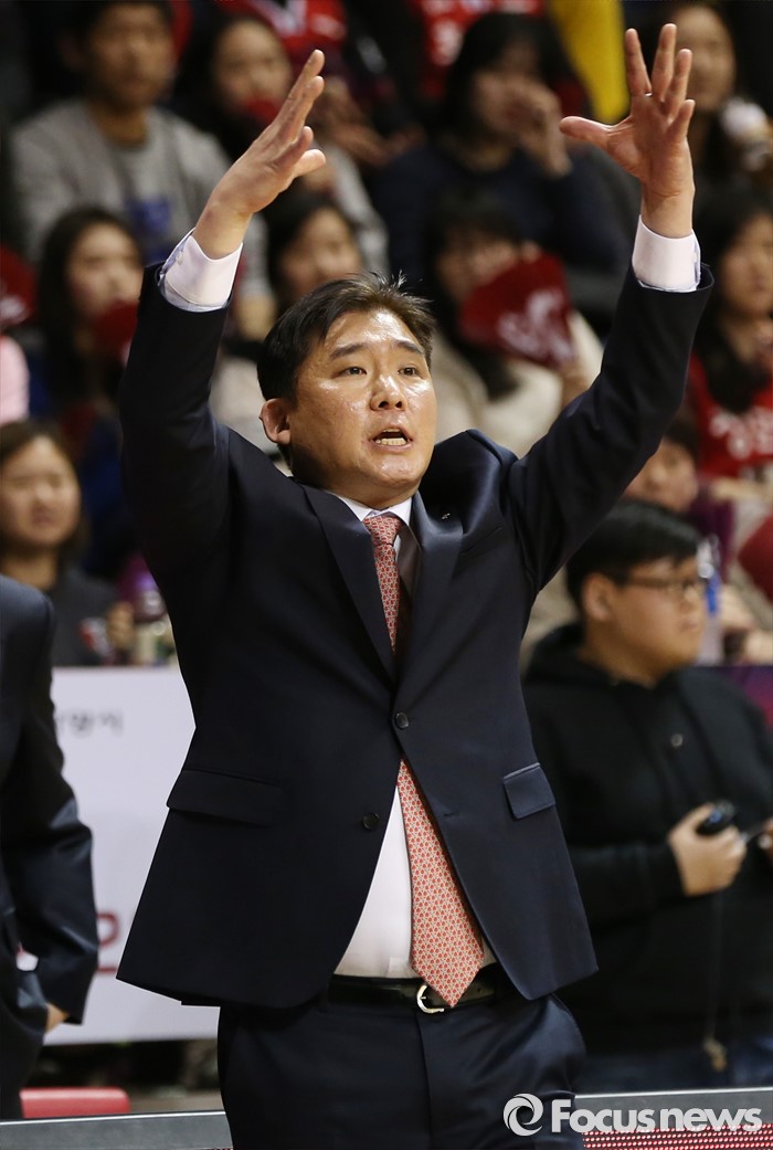(안양=포커스뉴스) 25일 안양실내체육관에서 열린 2015-2016 프로농구 6강 플레이오프 KGC-삼성 1차전에서 KGC 김승기 감독이 선수들에게 경기중 작전 사인을 보내고 있다.