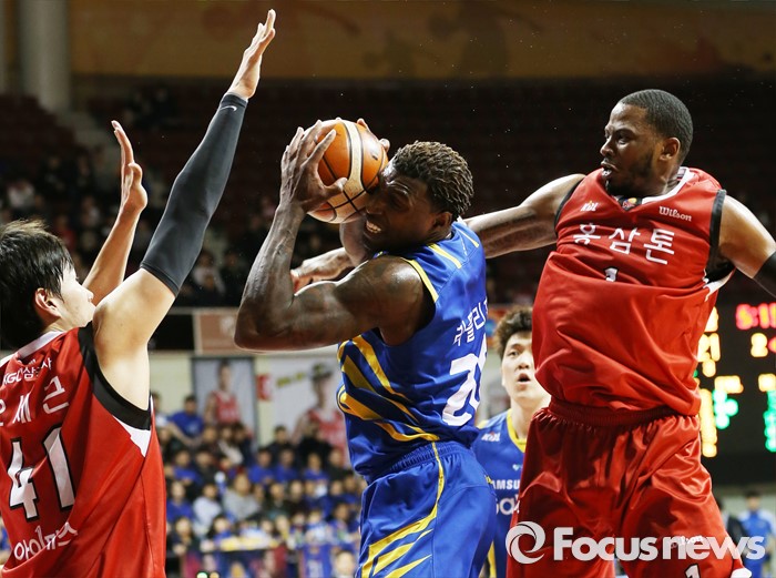 (안양=포커스뉴스) 25일 안양실내체육관에서 열린 2015-2016 프로농구 6강 플레이오프 KGC-삼성 1차전에서 KGC 오세근과 찰스 로드가 삼성 라틀리프를 앞뒤에서 마크하고 있다.